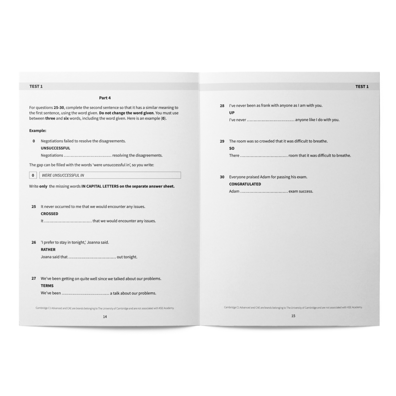Part 4 is made up of six questions (plus an example). Each question has a complete lead- in sentence, a key word, and a gapped sentence. Candidates must fill in the blank in the second sentence so that it means the same as the lead-in sentence.